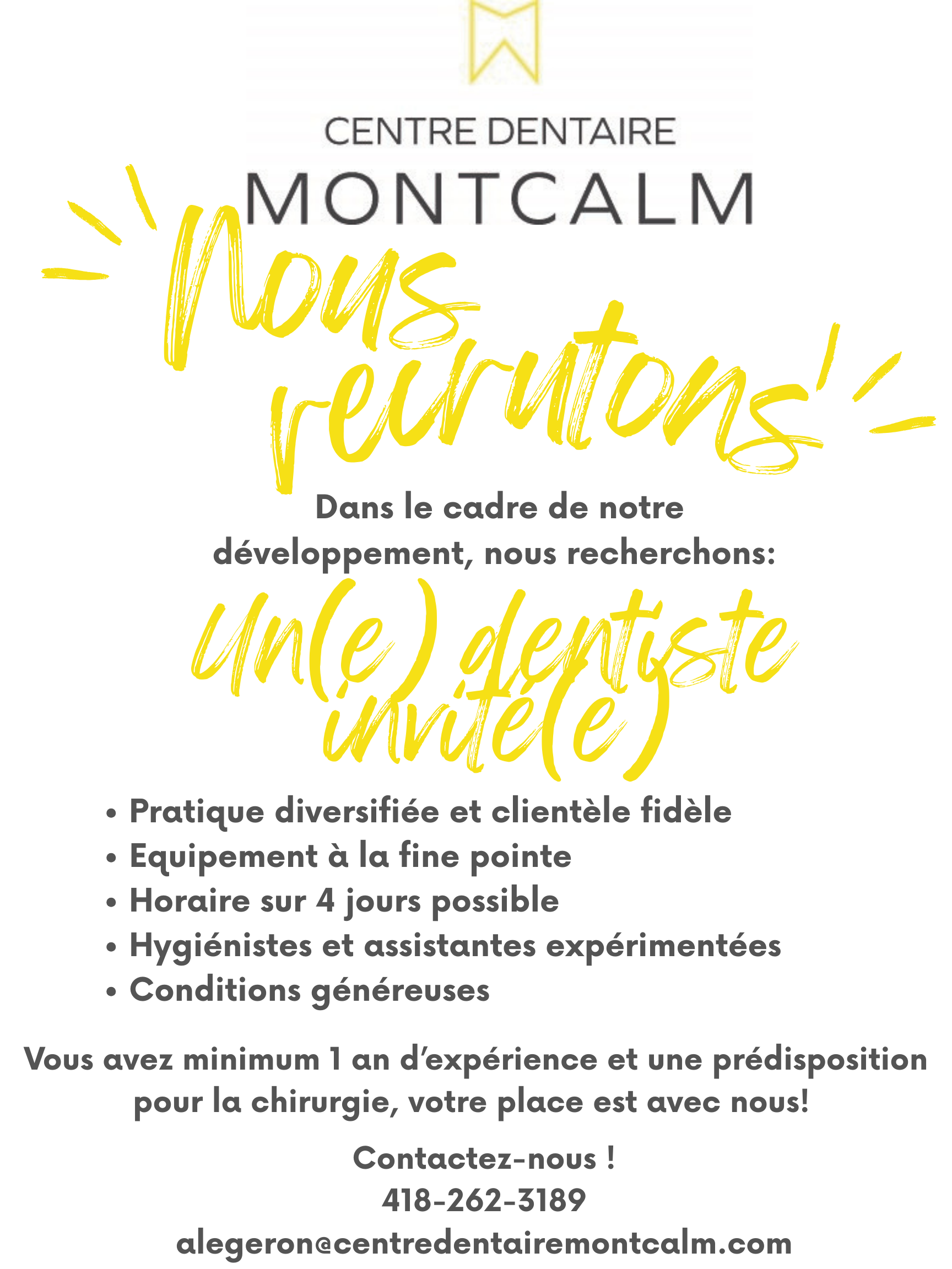Well-established dental clinic in the Montcalm neighbourhood of Quebec City. We have a growing, varied, and loyal patient base!