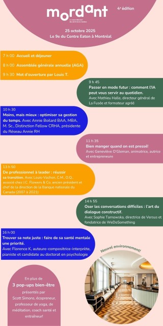 Pour une 4e année, MORDANT vous réserve un accès privilégié à des conférenciers chevronnés et à du contenu enrichissant, interactif, plus participatif! Il s’agit d’une journée de formation qui favorise la découverte, les échanges et le réseautage!